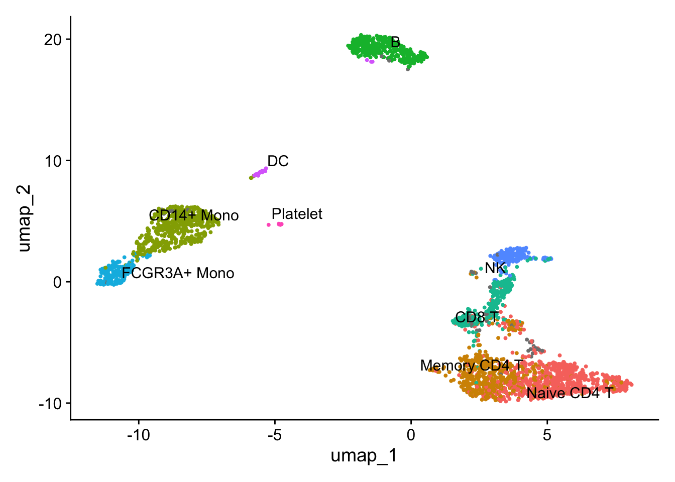 DimPlot(pbmc, label = TRUE, repel = TRUE) + NoLegend()